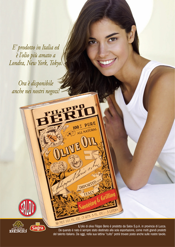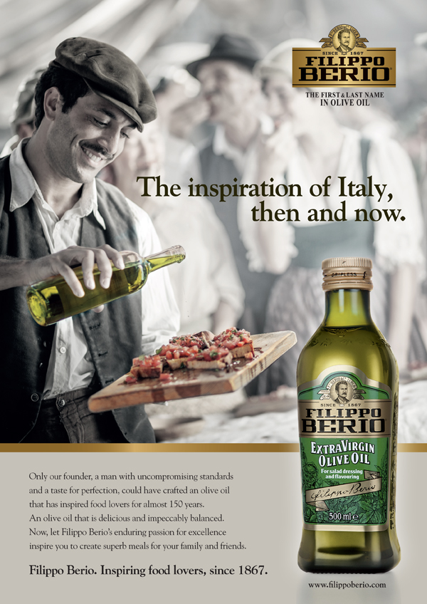 Druk advertenties af van de Italiaanse campagne “Geproduceerd in Italië, geliefd over de hele wereld”, ontworpen om Filippo Berio te promoten als een wereldwijd merk met authentieke Italiaanse roots sinds 1867.